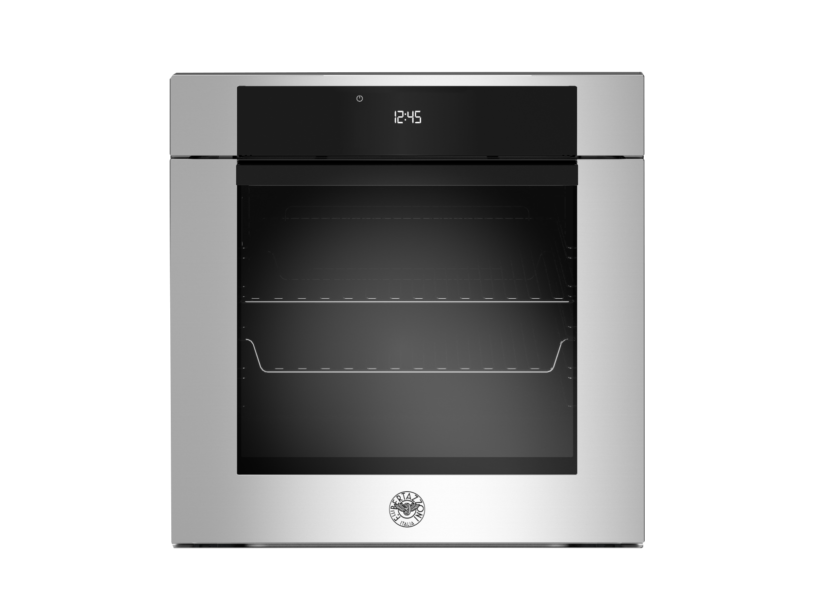 The Bertazzoni Modern Series 60cm built-in electric oven has a 76 litre capacity best-in-class cavity. With 11 functions it is ideal for mid-to low- temperature cooking, such as baking or recipes that require slow cooking, like casseroles. The non-convection mode is excellent for baking cakes, while the fan-assisted mode ensures even heat distribution on all five levels for roasting and baking with no flavour crossover. The oven is easily managed with the full touch black glass control panel with LCD display. The soft open-and-close door is safe and easy to use, fitted with a smart glass-finish handle. The door is quadruple-glazed for safety and energy efficiency. Available in stainless steel.