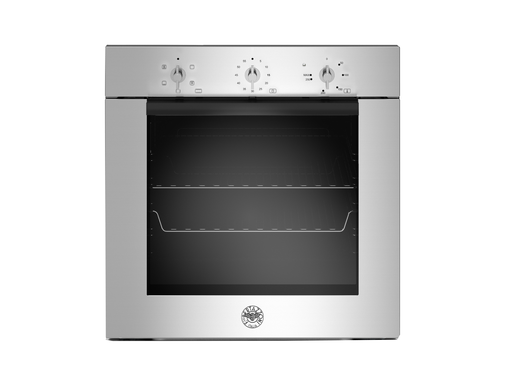 The Bertazzoni Modern Series 60cm built-in electric oven has a 76 litre capacity best-in-class cavity. With 5 functions it is ideal for mid-to low- temperature cooking, such as baking or recipes that require slow cooking, like casseroles. The non-convection mode is excellent for baking cakes, while the fan-assisted mode ensures even heat distribution on all five levels for roasting and baking with no flavour crossover. The infrared grill gives powerful searing and grilling over a large surface area. The oven is easily controlled by metal knobs with soft opening door with metal handle for ease of use. The door is double-glazed for safety and efficiency. Available in stainless steel.