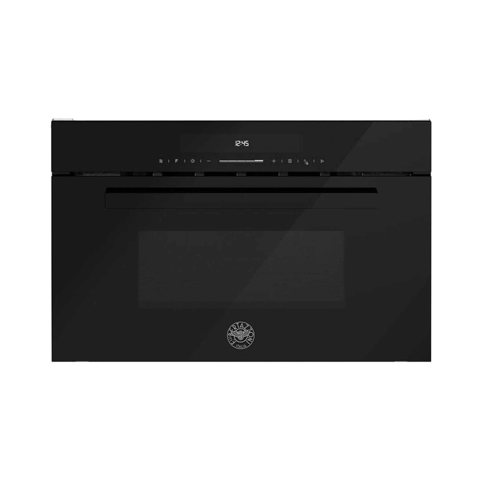 This Bertazzoni Modern Series microwave oven features 5 power levels and 3 functions: microwave, grill, and microwave-combined grill. It has a 34-liter stainless steel cavity and a glass turntable. Functions can be set using the intuitive touch digital programmer. The door has a front-opening mechanism.