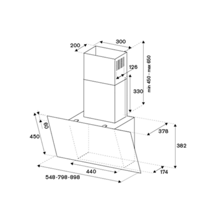 This Bertazzoni Modern Series 90cm vertical inclined hood is finished in black glass. It has a single motor offering three speeds and effective aluminium filters. Touch controls make it easy to adjust and two bright LED lights make it easy to see what you are doing on the hob. The powerful motor extracts 700 m3h max and is rated A+ energy class.