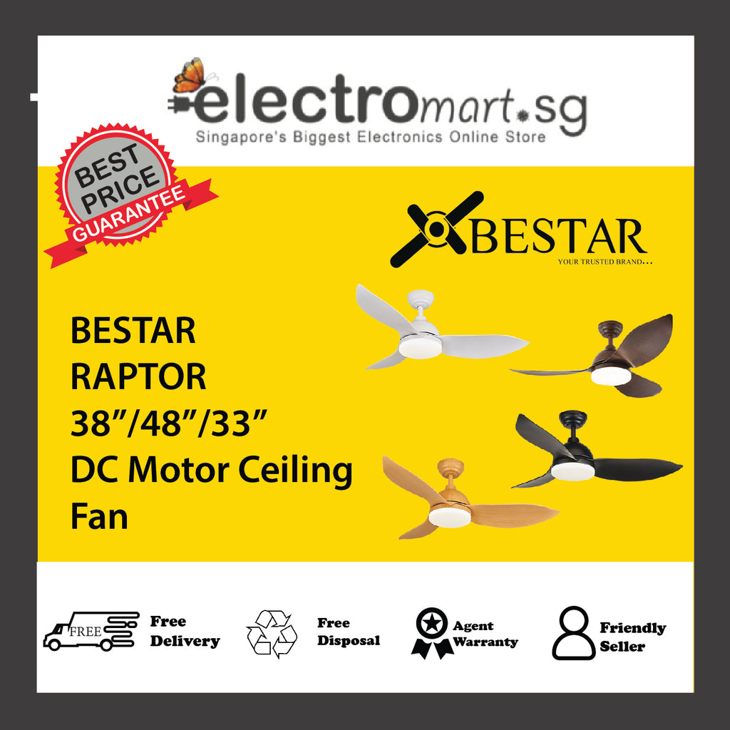 The Bestar Raptor is a modern, high-performance ceiling fan engineered to suit a variety of Singapore home spaces — from compact rooms to larger living areas. Available in three blade sizes (33″, 38″, 48″) and four stylish finishes, this fan combines smart features, efficient airflow and quiet operation for everyday comfort.