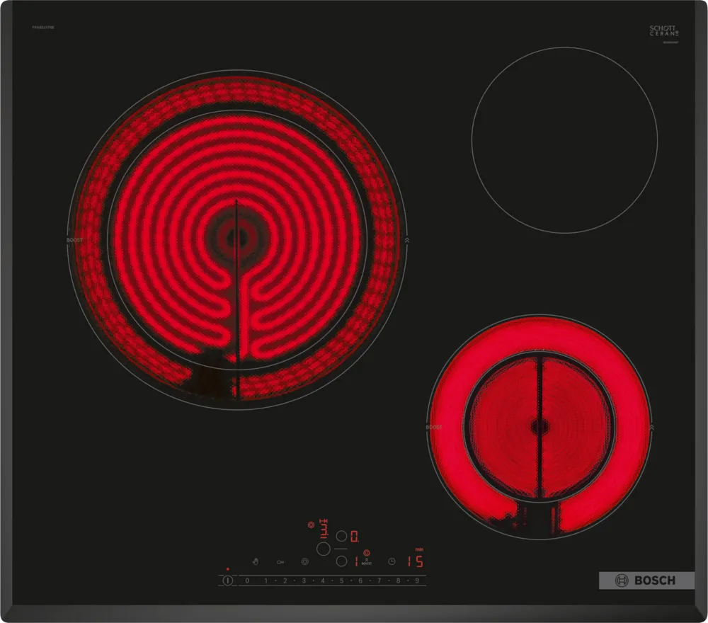 The Bosch Series 6 PKK651FP8E ceramic hob features a sleek frameless black glass design with 3 radiant zones—including an expandable dual-zone—combined with TouchControl MultiTouch for precise heat, timer, and child-lock settings.