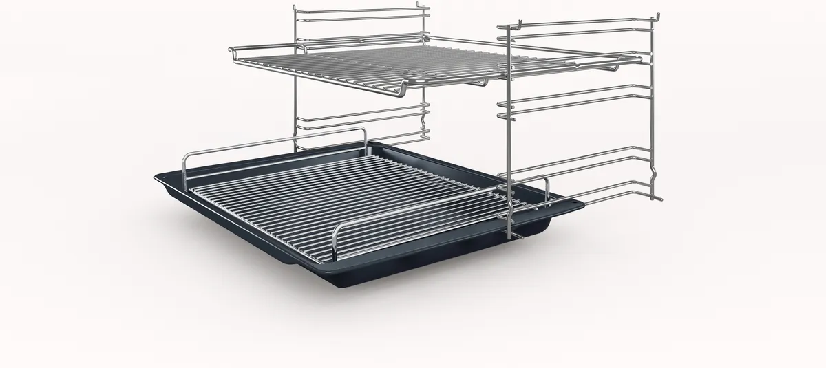- Five shelf positions and included accessories: insert grid, combination grid, universal pan
