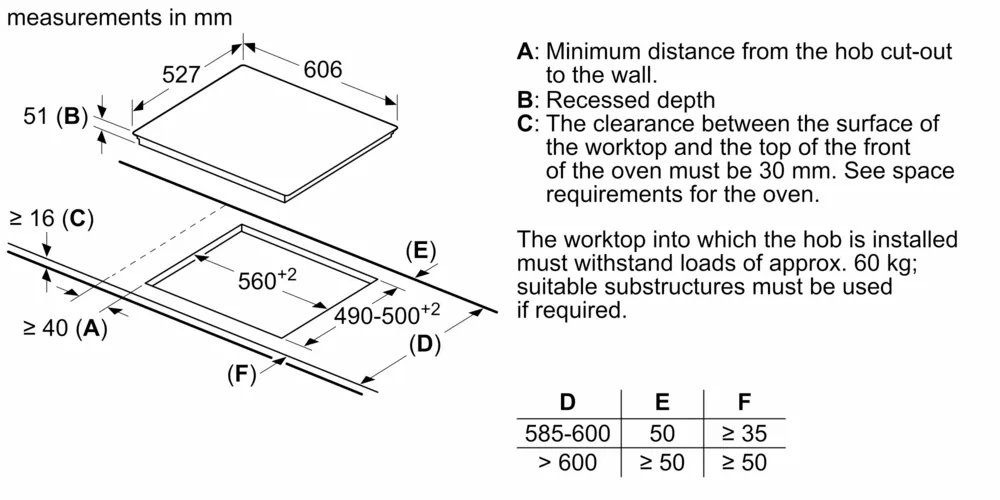 - Dimensions: 51 × 606 × 527 mm (H × W × D); niche size 51 × 560 × 490–500 mm; cord length 110 cm; total power 7.4 kW