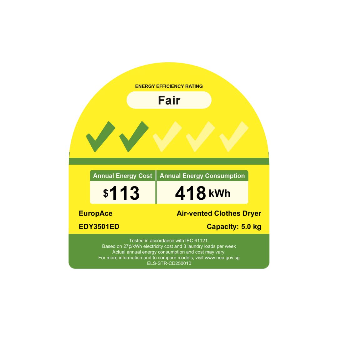 The Europace EDY3501EDWH is a 5 kg compact dryer designed for seamless drying performance in small Singapore homes, apartments or laundry spaces. Its intelligent drying system with UV sterilisation and fresh airflow options ensures clothes dry thoroughly while helping remove bacteria and allergens.