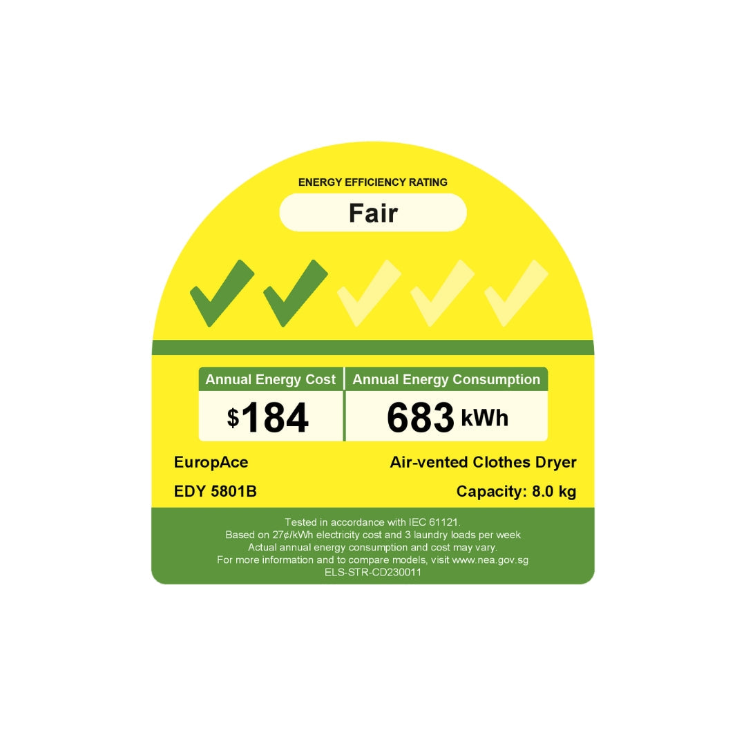 The Europace EDY5801B is an 8 kg vented dryer designed for efficient and effective drying performance in Singapore homes. With a range of preset drying programs and helpful convenience features, it’s a practical choice for daily laundry needs.