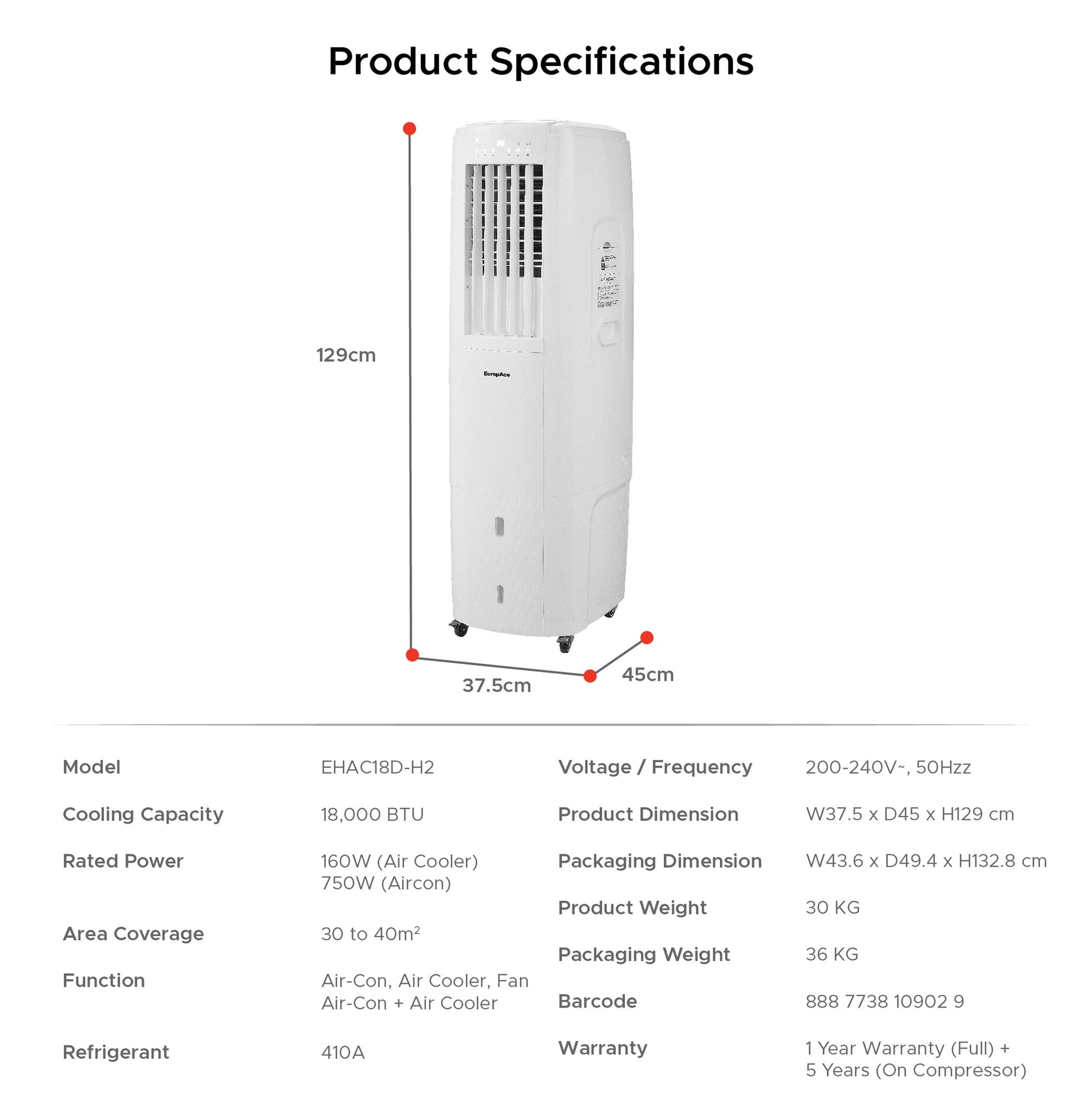 The Europace EHAC18DH2WH is a 4‑in‑1 hoseless air cooler with built‑in air‑con compressor designed for versatile and effective cooling in Singapore’s hot and humid conditions. Combining the functions of a portable air conditioner, air cooler, fan and dehumidifier, this unit delivers flexible cooling performance without the need for a traditional exhaust hose, making it ideal for open areas, covered patios, workshops and spacious rooms.