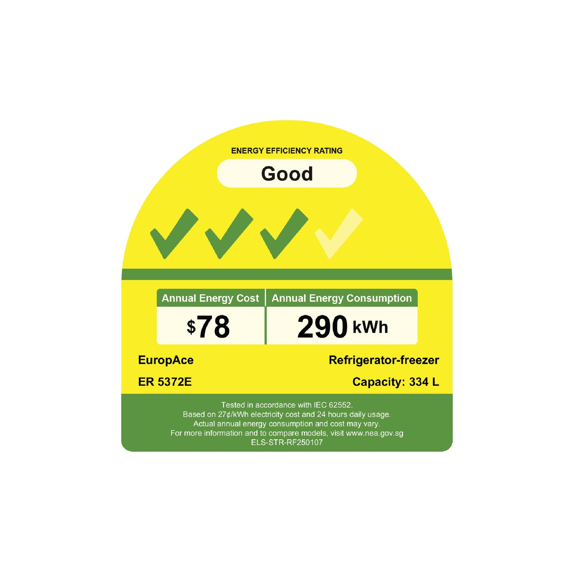 The Europace ER5372EMD is a 334 L top mount fridge designed for Singapore homes, combining spacious storage with no-frost convenience and energy efficient performance. Its inverter compressor, adjustable shelving and reversible door make it a practical choice for daily food and beverage storage.
