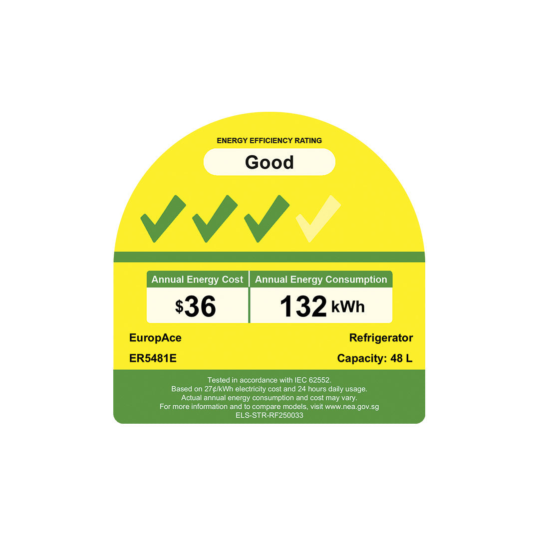 The Europace ER5481EBK is a sleek 48 L mini bar fridge designed for efficient chilling in compact Singapore spaces such as bedrooms, offices, dorms or entertainment corners. Its versatile cooling compartments and energy-saving performance make it perfect for everyday use.