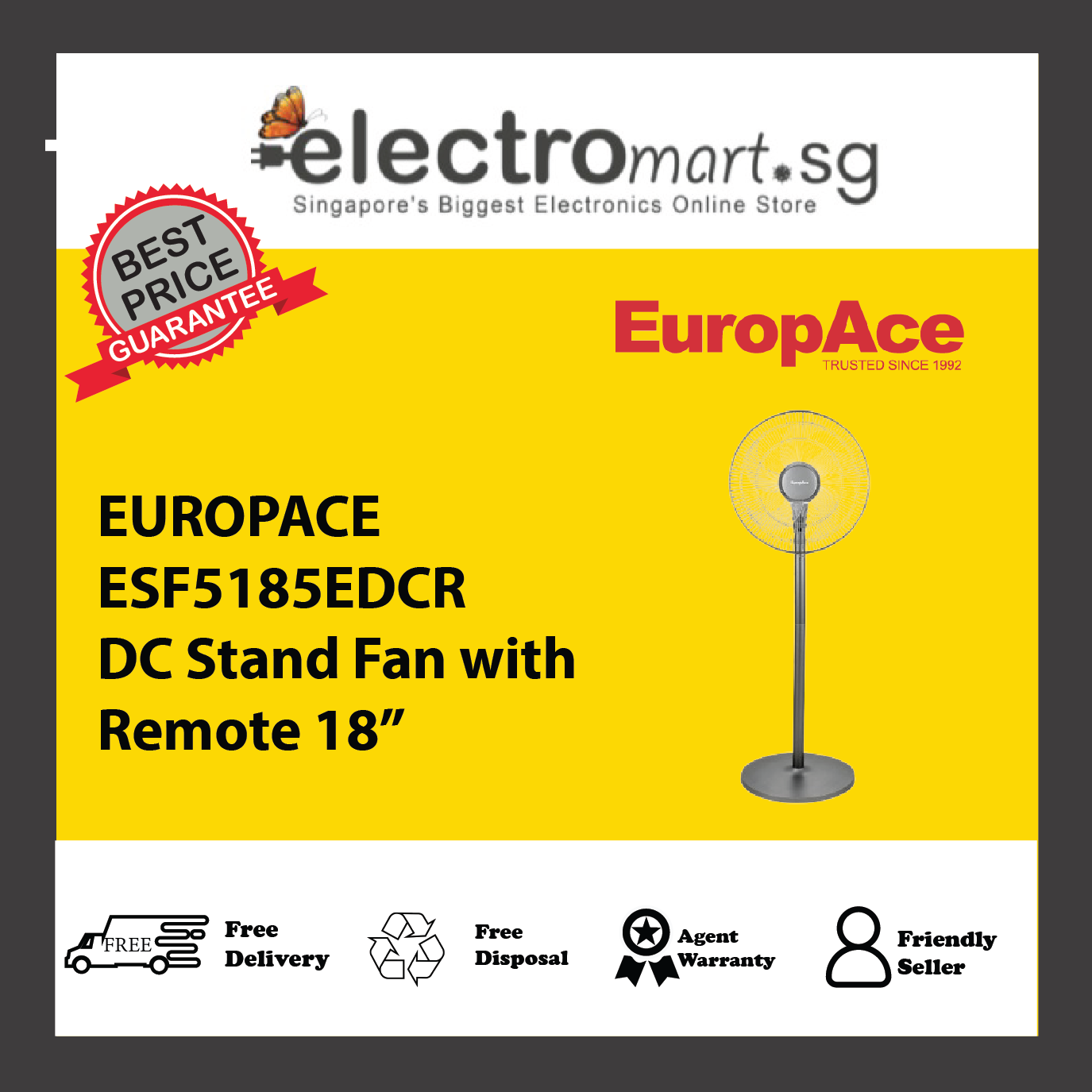 The Europace ESF5185EDCR is an 18‑inch DC stand fan designed for powerful, energy-efficient airflow with quiet operation and easy remote control — perfect for Singapore living rooms, bedrooms, or open spaces.