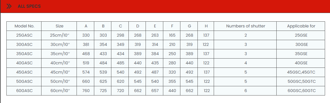 - Range of sizes available – matched shutters for blade diameters from 25 cm to 60 cm