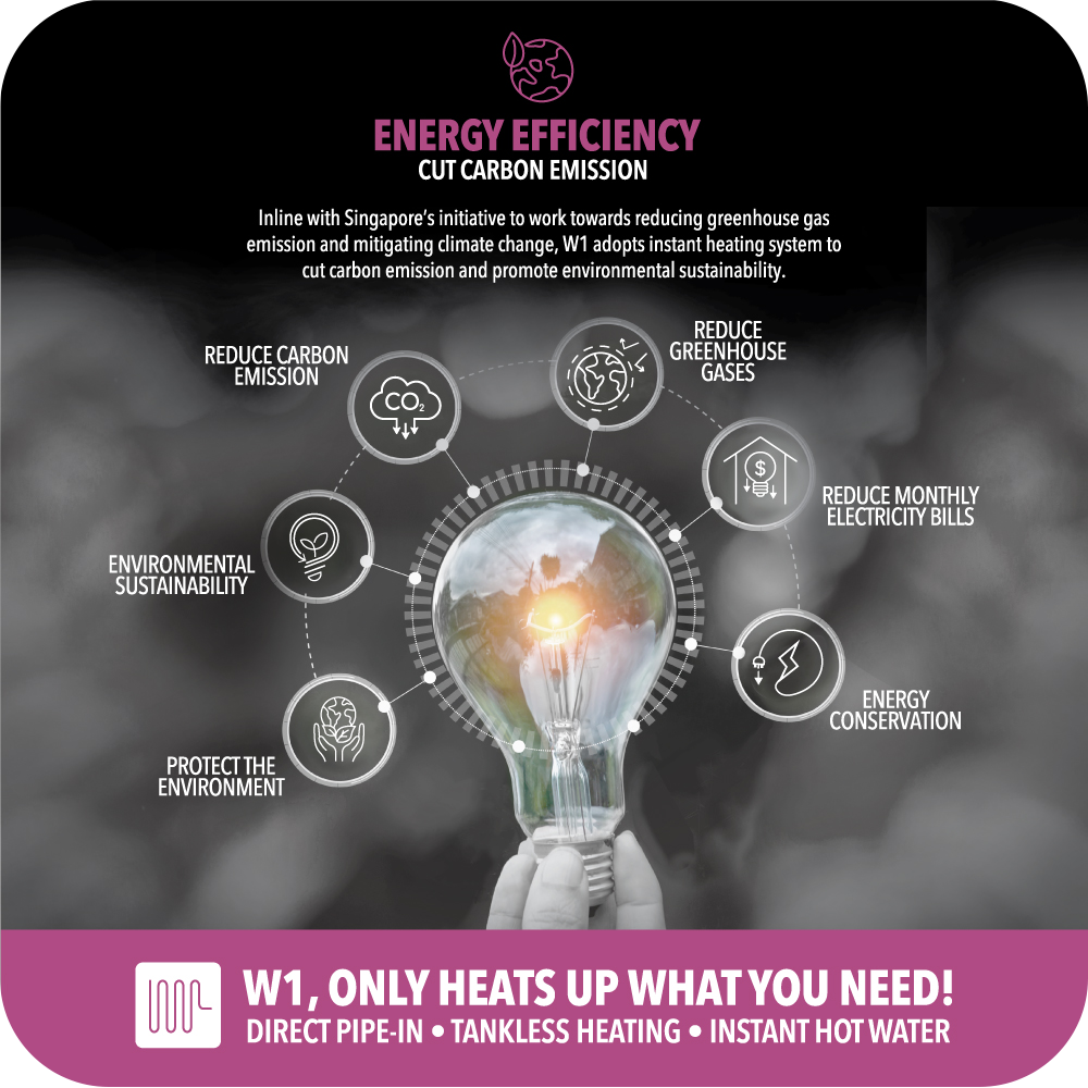 - Eco‑smart energy mode automatically heats and keeps water ready