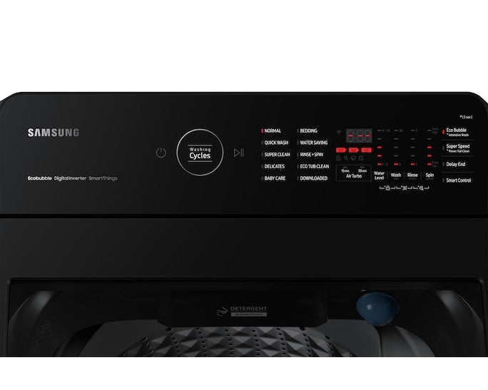 This 8 kg top-load washer in stylish Black Caviar finish offers powerful and gentle cleaning with EcoBubble™ technology, Super Speed cycle, and SmartThings app control—perfect for fast, eco-friendly wash cycles.