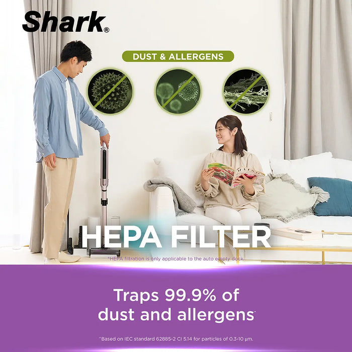 The Shark EvoPower System CS851 adapts its suction and brushroll speed with Smart iQ sensors that detect dirt levels, floor type and debris. The IQ+ model adds a hands-free Auto-Empty Dock that automatically charges and empties dust for up to 30 days.