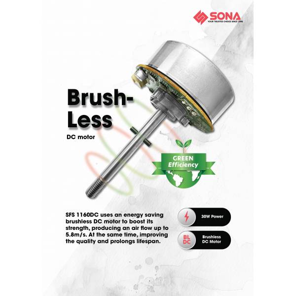 The SONA SFS‑1160DC features a full-copper coil brushless DC (BLDC) motor delivering strong airflow with minimal noise and power consumption. It comes with smart controls such as memory function, multi-speed settings, and a programmable timer with remote control—perfect for modern living.