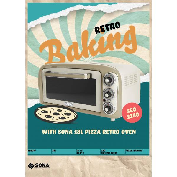The SONA SEO 2240 is a retro-style electric oven with an 18 L interior, designed for pizza, snacks, and light baking. It offers 1,100 W power, a 60‑minute timer, adjustable heat up to 230 °C, and comes with a pizza tray, grill rack, and removable crumb tray for easy cleaning.