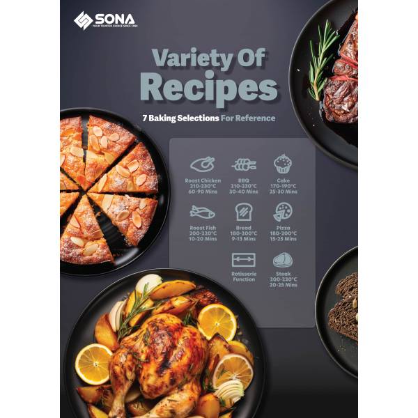 The SONA SEO 2288 offers generous 28 litre capacity with 1,500 W power for uniform cooking. It includes rotisserie functionality, double‑layer glass door, internal light, a 120‑minute timer, and six heat settings reaching up to 250 °C. Accessories include baking tray, wire rack, rotisserie rods, tools, and crumb tray.